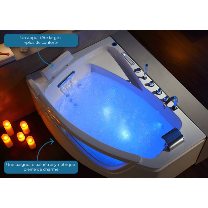 Baignoire balnéo asymétrique 160 × 110 × 75 cm – 42 jets, cascade LED