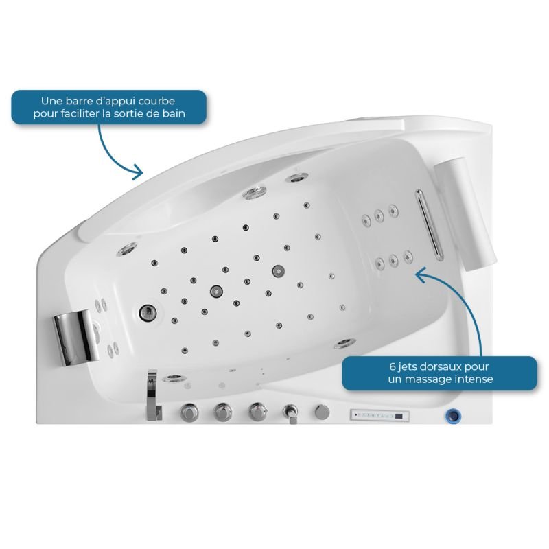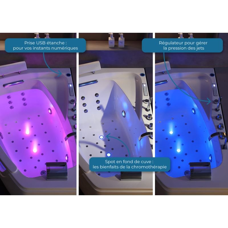 Ce modèle se distingue par ses effets de lumière chromatique intégrés, avec LED qui illuminent des zones clés telles que la cascade cervicale, créant une ambiance apaisante et personnalisée lorsque vous prenez votre bain.