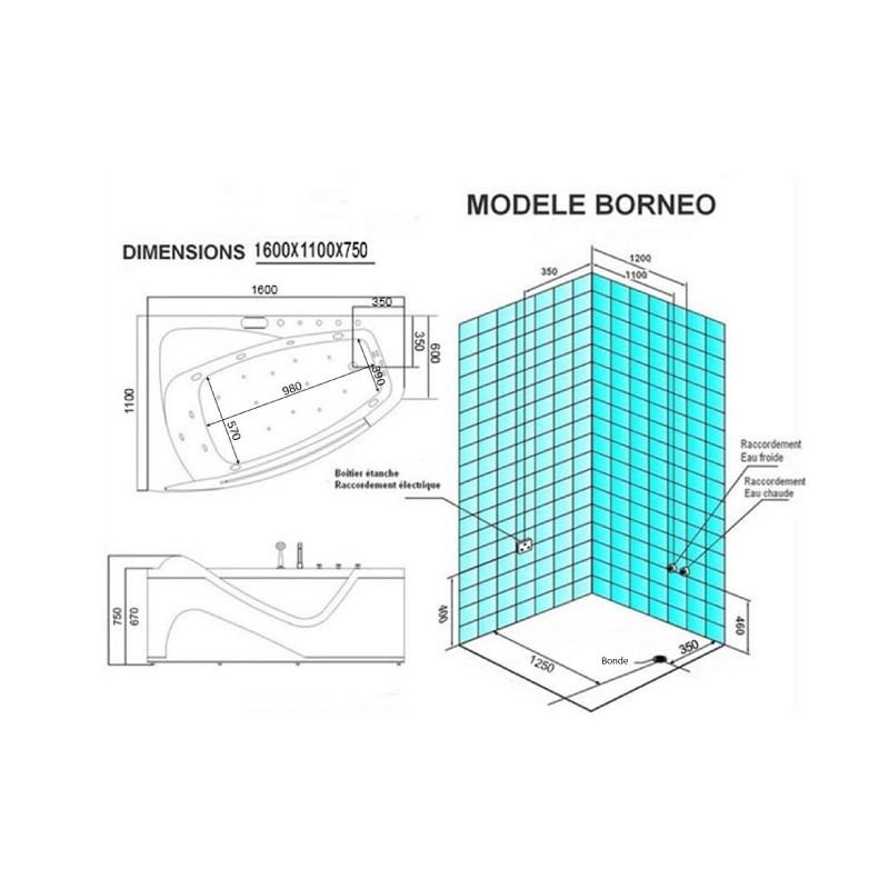 La structure repose sur une coque en acrylique renforcé de fibres de verre avec un châssis autoportant en inox pour une bonne stabilité, et les pieds antivibratiles réglables facilitent l’installation. Les dimensions généreuses d’environ 160 × 110 × 75 cm offrent un bain confortable sans compromettre l’espace dans la salle de bains.