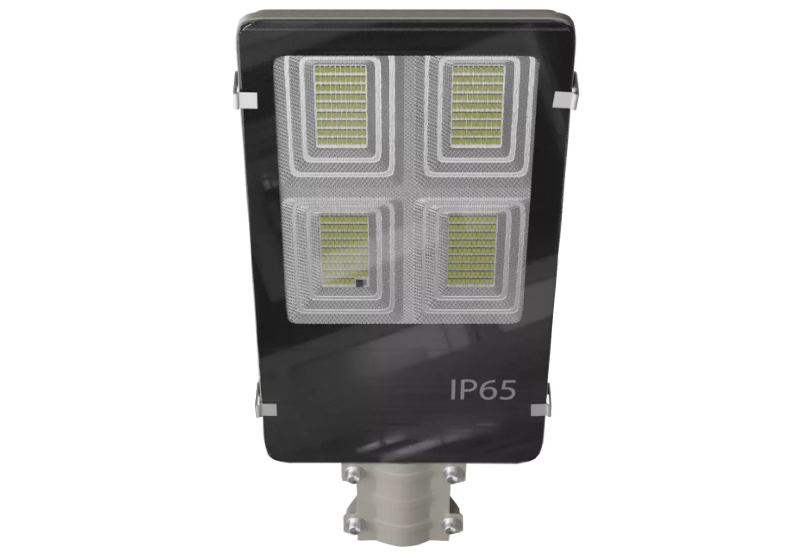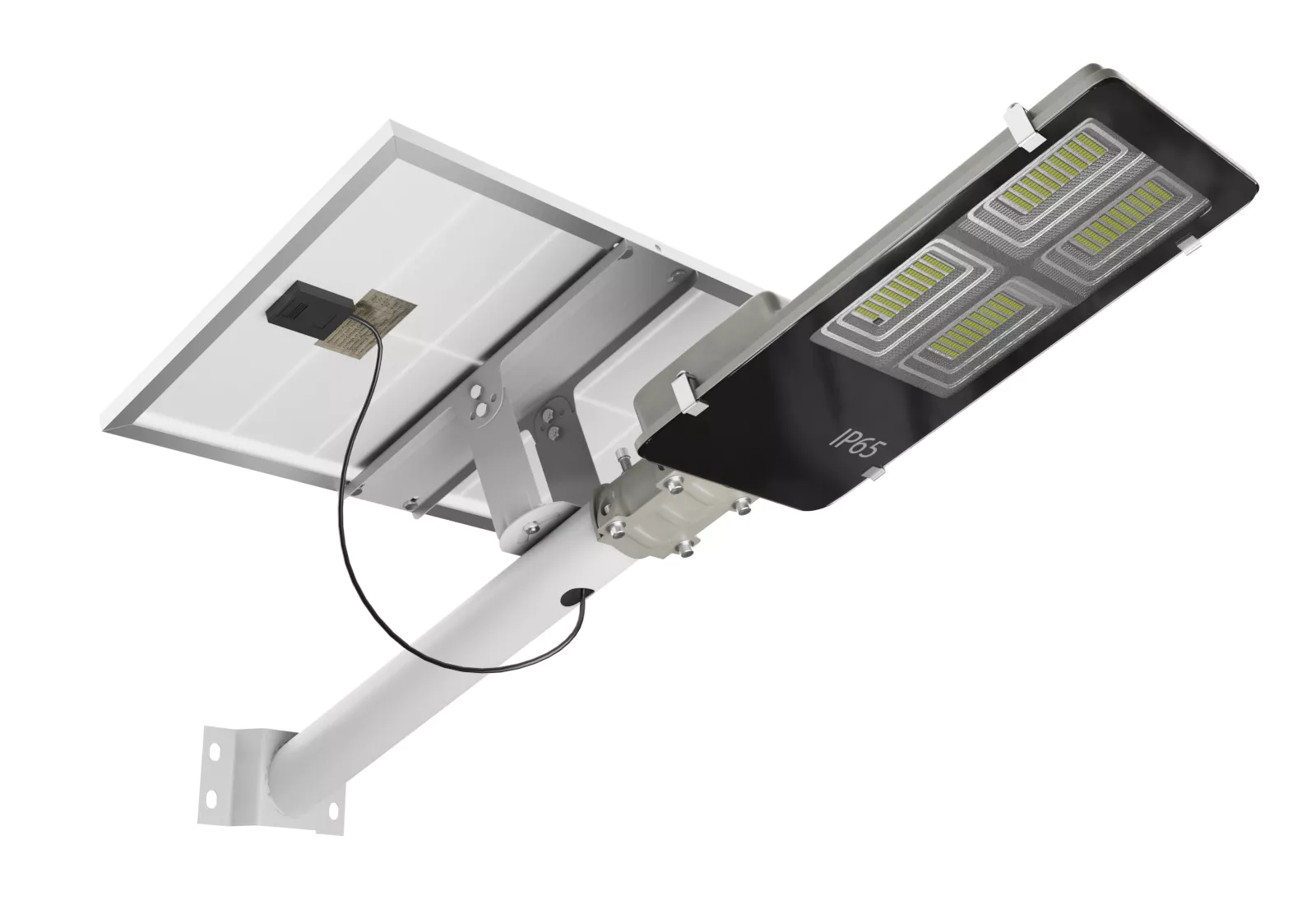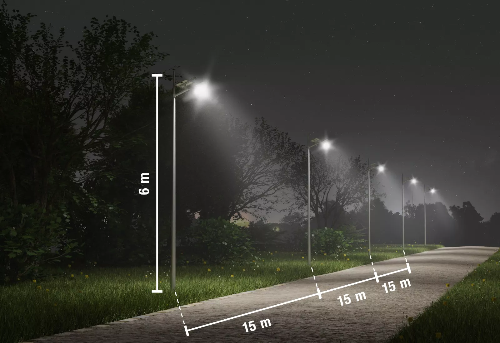 Le réverbère est monté sur un mât de 6 000 mm de hauteur, fabriqué en acier galvanisé et peint pour résister aux intempéries. La tête lumineuse et les éléments électroniques sont certifiés IP65, ce qui garantit une protection contre les projections d’eau et la poussière pour une utilisation fiable en extérieur.